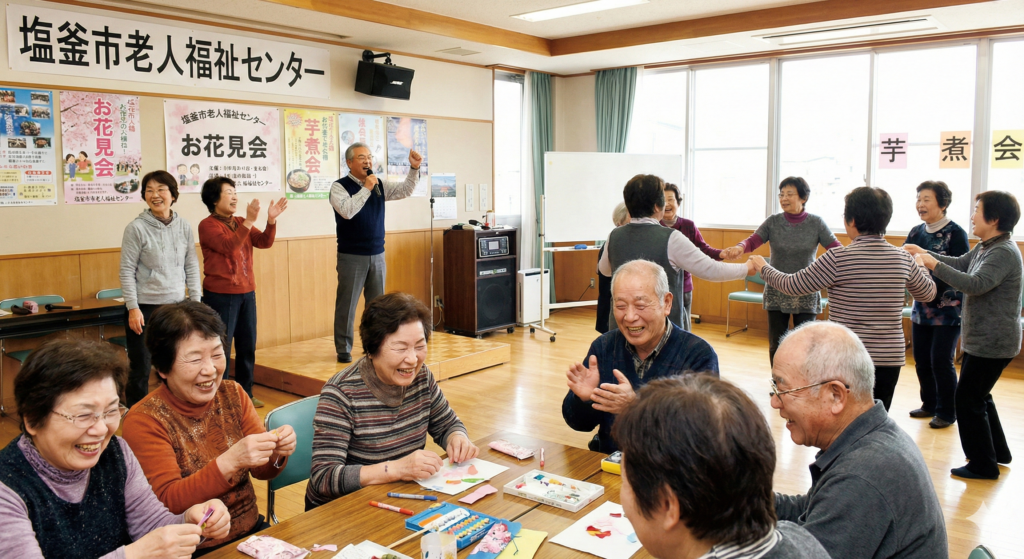 老人福祉センターは、市内の元気な高齢者の方々が自由に参加し、踊りやカラオケ等の趣味活動の他、健康づくりのための健康教室や塩竈の歴史を勉強する歴史散策教室など高齢者の生きがいづくりサロンとして運営されています。